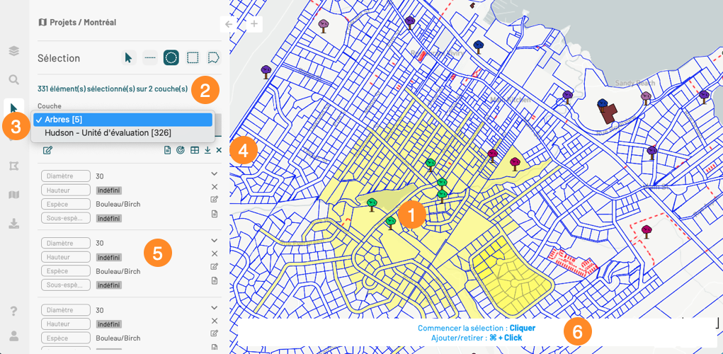 <table data-header-hidden><thead><tr><th width="74.92307692307693"></th><th></th></tr></thead><tbody><tr><td><strong>1</strong></td><td>Les objets ou éléments cartographiques sélectionnés sont indiqués en jaune dans la carte.<br>Si vous cliquez sur un élément en étant l'outil de sélection ponctuelle activé, l'élément demeure sélectionné et les autres éléments sont désélectionnés.</td></tr><tr><td><strong>2</strong></td><td>Cette légende indique le nombre d'éléments sélectionnés sur le nombre de couches concernées.</td></tr><tr><td><strong>3</strong></td><td><strong>Couche</strong><br>Sélectionnez la couche dont vous souhaitez afficher les fiches des éléments sélectionnés, afficher la table des attributs, exporter les données vers un fichier Excel ou désélectionner les éléments.<br>Ces opérations s'appliquent uniquement à la couche que vous choisissez.<br>Le nom de chaque couche est accompagné du nombre d'éléments sélectionnés.</td></tr><tr><td><strong>4</strong></td><td>Des outils sont disponibles pour travailler avec les éléments sélectionnés de la couche que vous avez indiqué dans la plage <strong>Couche</strong> :<br>1. Cliquez sur <img src="https://294136567-files.gitbook.io/~/files/v0/b/gitbook-x-prod.appspot.com/o/spaces%2FdAw9YBQHVS9E90BSZYQK%2Fuploads%2Fgit-blob-73da58f64bb1a9e80ff6752a66b1ee6a9429f818%2Fng-edit-all.png?alt=media" alt="" data-size="line"> pour modifier en lot les éléments sélectionnés. La section <a href="editer-des-donnees">Éditer des données</a> offre les détails sur ce sujet.<br>2. Cliquez sur <img src="https://294136567-files.gitbook.io/~/files/v0/b/gitbook-x-prod.appspot.com/o/spaces%2FdAw9YBQHVS9E90BSZYQK%2Fuploads%2Fgit-blob-a99f960e3ae0ff7ab5218524a445b7eb689c47e2%2Fng-rapport-selection.png?alt=media" alt="" data-size="line"> pour ouvrir un rapport d'information de la sélection dans un nouvel onglet de votre navigateur. <br>La section <a href="../afficher-les-informations-des-elements/rapports-dinformation#rapport-dun-ensemble-delements-cartographiques">Rapports d'information</a> offre des détails sur ce sujet.<br>3. Cliquez sur <img src="https://294136567-files.gitbook.io/~/files/v0/b/gitbook-x-prod.appspot.com/o/spaces%2FdAw9YBQHVS9E90BSZYQK%2Fuploads%2Fgit-blob-ce5a3472617a74a4c453baac607da2619ad53d15%2Fng-centrer.png?alt=media" alt="" data-size="line"> pour centrer la carte sur l'ensemble des éléments sélectionnés. L'échelle change et il se peut que la couche ne soit plus visible.<br>4. Cliquez sur <img src="https://294136567-files.gitbook.io/~/files/v0/b/gitbook-x-prod.appspot.com/o/spaces%2FdAw9YBQHVS9E90BSZYQK%2Fuploads%2Fgit-blob-a1fb2c3382425ee17587ef09b75f0f27f810bb11%2Fng-table.png?alt=media" alt="" data-size="line"> pour ouvrir une table qui présente les données des attributs des éléments sélectionnés. L'icône devient foncée. La section <a href="#table-dattributs">Table d'attributs</a> présente les détails de la table.<br>5. Cliquez sur <img src="https://294136567-files.gitbook.io/~/files/v0/b/gitbook-x-prod.appspot.com/o/spaces%2FdAw9YBQHVS9E90BSZYQK%2Fuploads%2Fgit-blob-a1fb2c3382425ee17587ef09b75f0f27f810bb11%2Fng-table.png?alt=media" alt="" data-size="line"> pour fermer la table d'attributs.<br>6. Cliquez sur <img src="https://294136567-files.gitbook.io/~/files/v0/b/gitbook-x-prod.appspot.com/o/spaces%2FdAw9YBQHVS9E90BSZYQK%2Fuploads%2Fgit-blob-6286dbad50ae93f05b8b0ef5a09b47616e0dbd86%2Fng-download.png?alt=media" alt="" data-size="line"> pour télécharger un fichier Excel contenant les attributs de tous les éléments sélectionnés.<br>7. Cliquez sur <img src="https://294136567-files.gitbook.io/~/files/v0/b/gitbook-x-prod.appspot.com/o/spaces%2FdAw9YBQHVS9E90BSZYQK%2Fuploads%2Fgit-blob-28f35f7b796a82f9cdddbaeecf24b2b71cb76f17%2Fng-deselect-all.png?alt=media" alt="" data-size="line"> pour désélectionner tous les éléments.</td></tr><tr><td><strong>5</strong></td><td>Pour chaque élément sélectionné, une fiche présente les valeurs des attributs :<br>1. Glissez la liste de fiches avec le pointeur pour la parcourir. Il y a une fiche pour chaque élément sélectionné.<br>2. Cliquez sur la fiche d'un élément pour centrer la carte sur lui. Cliquez sur <img src="https://294136567-files.gitbook.io/~/files/v0/b/gitbook-x-prod.appspot.com/o/spaces%2FdAw9YBQHVS9E90BSZYQK%2Fuploads%2Fgit-blob-b129c9e7105bd624e18c88680a4510de0378f0af%2Fng-last-zoom.png?alt=media" alt="" data-size="line"> si vous souhaitez retourner à la vue précédente.<br>3. Cliquez sur <img src="https://294136567-files.gitbook.io/~/files/v0/b/gitbook-x-prod.appspot.com/o/spaces%2FdAw9YBQHVS9E90BSZYQK%2Fuploads%2Fgit-blob-3ef6e36961f3221b541c85b50d009b2753c9ad34%2Fng-arrow-little-down.png?alt=media" alt="" data-size="line"> pour maximiser la fiche et afficher tous les attributs.<br>4. Cliquez sur <img src="https://294136567-files.gitbook.io/~/files/v0/b/gitbook-x-prod.appspot.com/o/spaces%2FdAw9YBQHVS9E90BSZYQK%2Fuploads%2Fgit-blob-82b6d8306caa85e32805adee614d7df057f8680d%2Fng-arrow-little-up.png?alt=media" alt="" data-size="line"> pour minimiser la fiche.<br>5. Cliquez sur <img src="https://294136567-files.gitbook.io/~/files/v0/b/gitbook-x-prod.appspot.com/o/spaces%2FdAw9YBQHVS9E90BSZYQK%2Fuploads%2Fgit-blob-e3616e3871e36ef986dcb11bbef2d125a9626b35%2Fng-edit.png?alt=media" alt="" data-size="line"> pour éditer l'élément. <br>La section <a href="editer-des-donnees">Éditer des données</a> offre les détails sur ce sujet.<br>6. Cliquez sur <img src="https://294136567-files.gitbook.io/~/files/v0/b/gitbook-x-prod.appspot.com/o/spaces%2FdAw9YBQHVS9E90BSZYQK%2Fuploads%2Fgit-blob-da34d65c337ab76003c7fdfbca69d471cac0031c%2Fng-rapport.png?alt=media" alt="" data-size="line"> pour ouvrir le rapport d'information de l'élément. <br>La section <a href="afficher-les-informations-des-elements/rapports-dinformation">Rapports d'information</a> offre des détails sur ce sujet.<br>7. Cliquez sur pour désélectionn