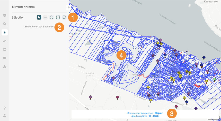 <table data-header-hidden><thead><tr><th width="74.58671586715869"></th><th></th></tr></thead><tbody><tr><td><strong>1</strong></td><td>Outils de sélection.</td></tr><tr><td><strong>2</strong></td><td>La légende indique le nombre de couches dont les éléments sont sélectionnables.</td></tr><tr><td><strong>3</strong></td><td>Aide à la sélection interactive.</td></tr><tr><td><strong>4</strong></td><td>La carte affiche les couches dont les éléments sont sélectionnables.</td></tr></tbody></table>