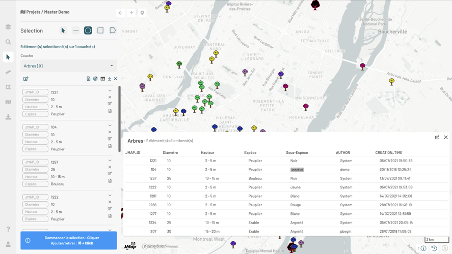 Vous pouvez sélectionner de manière interactive des éléments de la carte appartenant à une ou plusieurs couches à l'aide des outils de sélection. Vous pouvez par la suite examiner les attributs des éléments ainsi sélectionnés et exporter les informations en différents formats.