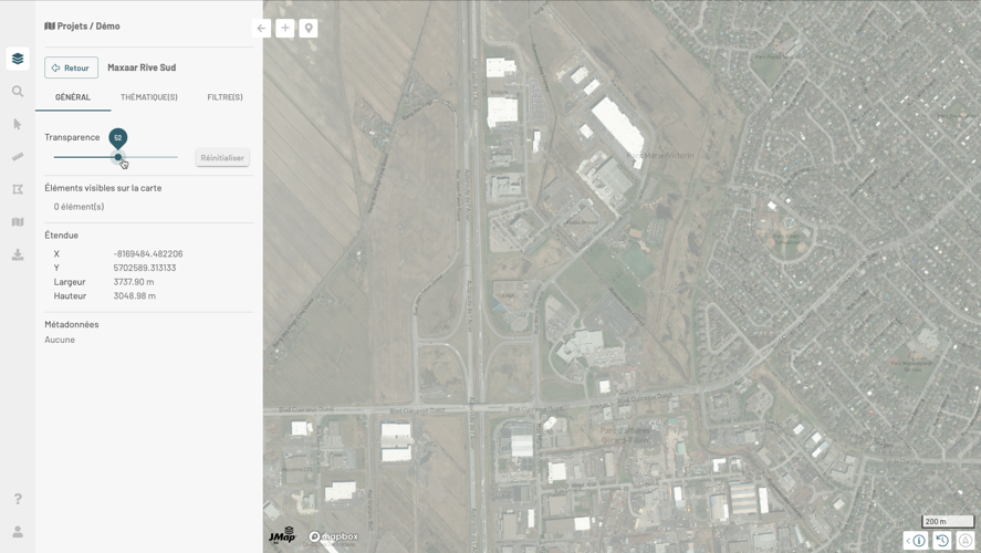 2. La fonction **Transparence**, disponible pour les couches de données matricielles, permet d’ajuster avec une glissière le niveau de transparence entre 0 % (valeur par défaut) et 100 %. La transparence est conservé lorsque vous enregistrez votre carte (section [Créer et gérer des cartes personnalisées](https://docs-jmapserver-lima.k2geospatial.com/f/applications/guide-dutilisation-de-jmap-ng/je-souhaite.../creer-et-gerer-des-cartes-personnalisees)).