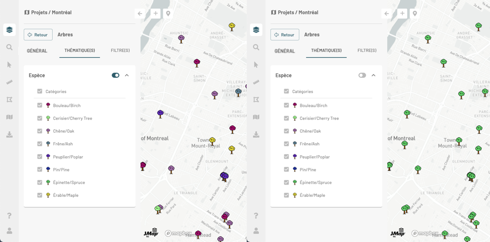 2. Utilisez l'interrupteur pour activer ou désactiver chaque thématique. L'apparence des objets de la couche change en fonction du choix.