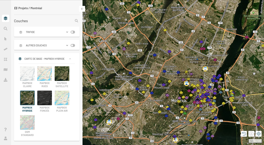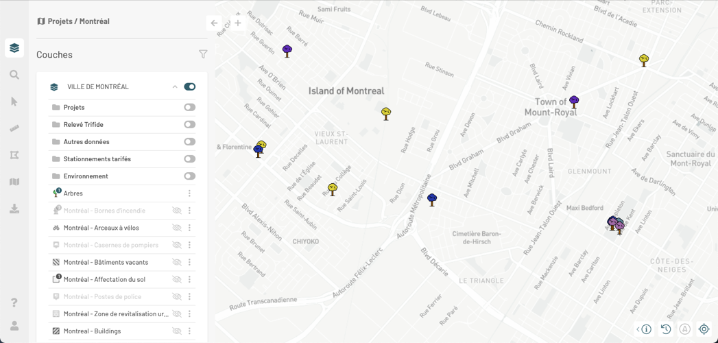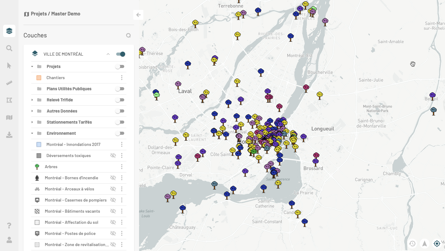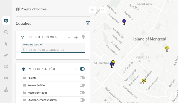 7. Cliquez sur <img src="https://294136567-files.gitbook.io/~/files/v0/b/gitbook-x-prod.appspot.com/o/spaces%2FdAw9YBQHVS9E90BSZYQK%2Fuploads%2Fgit-blob-a86da9b54422586a72c77ab4508a27fe449d7a69%2Fng-filtre-actif.png?alt=media" alt="" data-size="line"> pour enlever le filtre de couches. Les couches s'affichent dans le panel **Couches**. Vous devez activer l'affichage des couches pour les visualiser dans la carte.