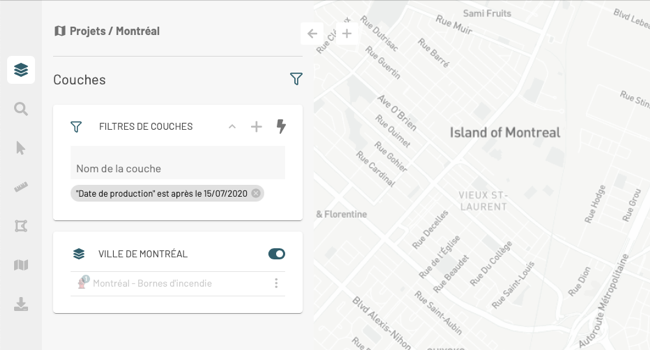 5. Cliquez **Ajouter**. Le filtre s'affiche dans le carton **Filtres de couches**. Seules les couches qui passent le filtre s'affichent dans la panel **Couches**.