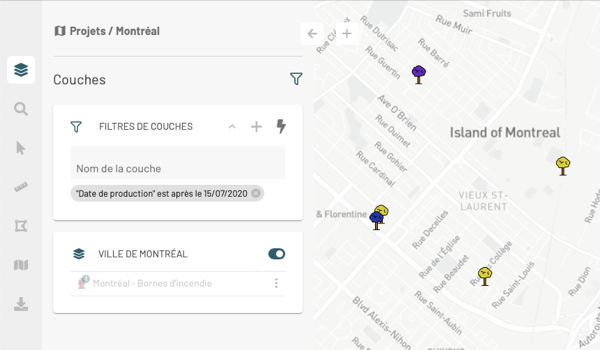 6. Cliquez sur <img src="https://294136567-files.gitbook.io/~/files/v0/b/gitbook-x-prod.appspot.com/o/spaces%2FdAw9YBQHVS9E90BSZYQK%2Fuploads%2Fgit-blob-8a2485712a61a6f9860621e82631f3be63cc8997%2Fng-filtre-appliquer.png?alt=media" alt="" data-size="line"> pour appliquer le filtre sur la carte. Seules les couches qui passent le filtre et dont l'affichage est activé se visualisent dans la carte.