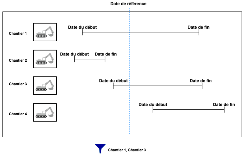 Seuls les éléments de la couche dont la date de référence est comprise entre la date de début et la date de fin sont affichés dans la carte.