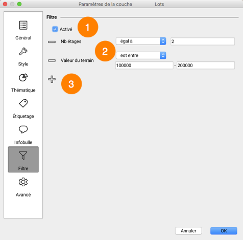 <table data-header-hidden><thead><tr><th width="72.92307692307693"></th><th></th></tr></thead><tbody><tr><td><strong>1</strong></td><td>Cochez la case pour activer le filtre. Les éléments qui ne passent pas le filtre ne s'affichent pas dans la couche.<br>Vous pouvez désactiver le filtre sans l'effacer.</td></tr><tr><td><strong>2</strong></td><td>Attributs qui composent le filtre.<br>Chaque attribut comporte un <a href="#operateurs-des-filtres">opérateur</a> et une valeur de l'attribut. Les opérateurs varient en fonction du type d'attribut.</td></tr><tr><td><strong>3</strong></td><td>Cliquez sur l'icône pour ajouter un autre attribut au filtre.</td></tr></tbody></table>