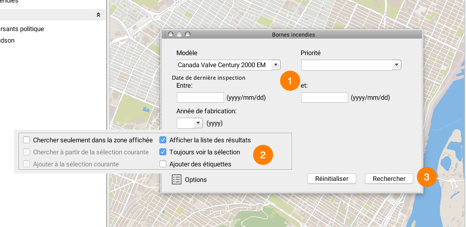 <table data-header-hidden><thead><tr><th width="74.61565836298931"></th><th></th></tr></thead><tbody><tr><td><strong>1</strong></td><td><p>Remplissez les champs du formulaire.<br>Dans cet exemple, sélectionnez dans la liste le nom de l'élément recherché.</p><p>Vous pouvez écrire seulement quelques lettres, la liste affiche les valeurs que les contiennent.</p></td></tr><tr><td><strong>2</strong></td><td>Appuyez sur le bouton <strong>Options</strong> pour afficher la liste des options de recherches.<br>Les options suivantes sont disponibles :<br><strong>Chercher seulement dans la zone affichée</strong> : La recherche s'effectue seulement dans la zone visible à l'écran.<br><strong>Chercher à partir de la sélection courante</strong> : La recherche s'effectue seulement parmi les éléments déjà sélectionnés.<br><strong>Ajouter à la sélection courante</strong> : Le résultat obtenu s'ajoute aux éléments déjà sélectionnés.<br><strong>Afficher la liste des résultats</strong> : Afficher la liste des résultats dans l'explorateur d'éléments.<br><strong>Toujours voir la sélection</strong> : Afficher les résultats, même en dehors des seuils de visibilité des couches concernées (utile quand les résultats peuvent être répartis sur un très grand territoire).<br><strong>Ajouter des étiquettes</strong> : Afficher une étiquette sur chaque élément trouvé (améliore la visibilité des résultats).</td></tr><tr><td><strong>3</strong></td><td>Appuyez sur <strong>Rechercher</strong> pour lancer la recherche.<br>Appuyez sur <strong>Réinitialiser</strong> pour réinitialiser le formulaire.</td></tr></tbody></table>