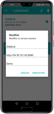 4. Touchez ![](https://294136567-files.gitbook.io/~/files/v0/b/gitbook-x-prod.appspot.com/o/spaces%2FdAw9YBQHVS9E90BSZYQK%2Fuploads%2Fgit-blob-027359a9090253b3f76ddc727d346373cc2c64f7%2Fsurvey-android_modifier.png?alt=media) pour ouvrir la fenêtre **Modifier** dans laquelle effectuer les changements dans les noms de projet et/ou l'URL du serveur.