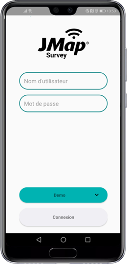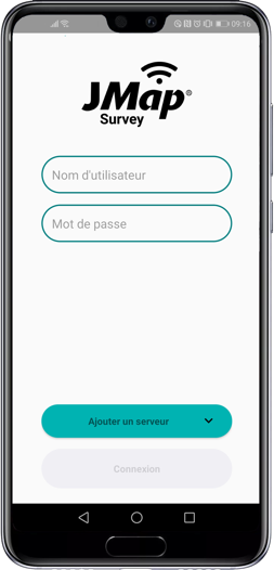 6. Touchez **Connexion**. L'interface graphique affiche la carte centrée dans la localisation de votre dispositif. La section [Interface graphique](https://docs-jmapserver-lima.k2geospatial.com/f/applications/guide-dutilisation-de-jmap-survey/introduction/interface-graphique) offre les détails pour personnaliser la carte affichée.