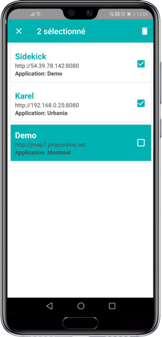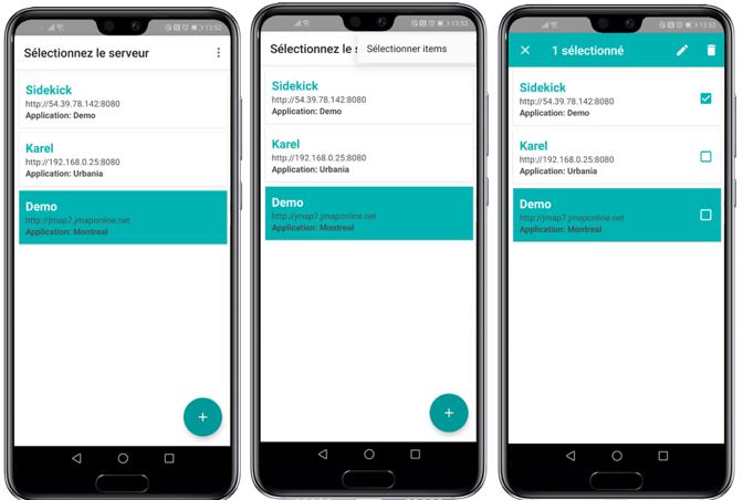 Dans l'écran d'accueil de JMap Survey, vous pouvez vous connecter à d'autres projets à partir de l'écran **Sélectionnez le serveur** :
