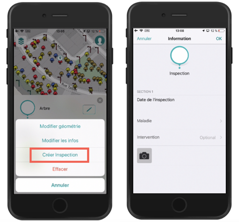 1. Touchez le raccourci au sous-formulaires qui vous intéresse. Dans l'exemple de la figure, un sous-formulaire *Inspection* existe et son raccourci s'appelle **Créer inspection**. Touchez **Créer inspection** pour créer un sous-formulaire associé au formulaire d'attributs de l'objet.