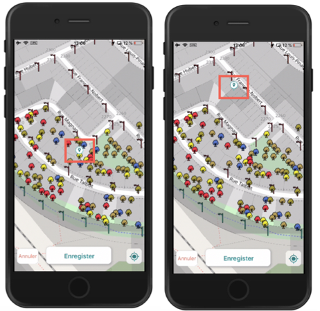 1. Touchez la carte pour indiquer la nouvelle localisation, un marqueur indique la place choisie. Vous pouvez aussi toucher ![](https://294136567-files.gitbook.io/~/files/v0/b/gitbook-x-prod.appspot.com/o/spaces%2FdAw9YBQHVS9E90BSZYQK%2Fuploads%2Fgit-blob-89410485f29dbe7a9723f96bf2868b8930a40ad5%2Fsurvey-geolocalize.png?alt=media) pour amener l'objet à votre emplacement actuel.\\