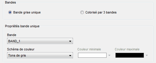 Lorsque l'on choisit l'option **Bande grise unique**, il est possible de modifier les propriétés de cette bande et de produire différents schémas de couleur. Une série de schémas prédéfinis est offerte mais il est aussi possible de faire le choix d'une couleur minimale et maximale. Les valeurs entre les deux seront interpolées.