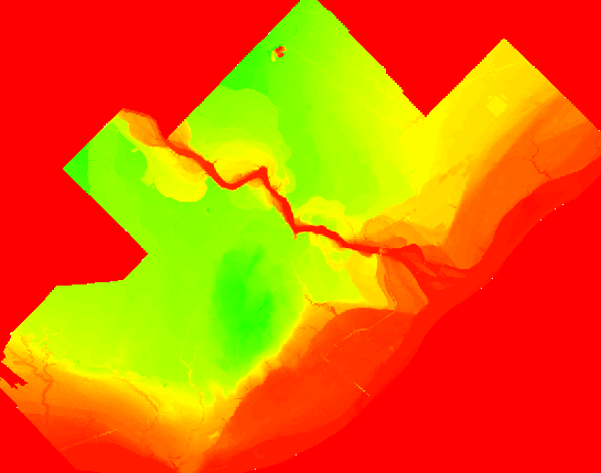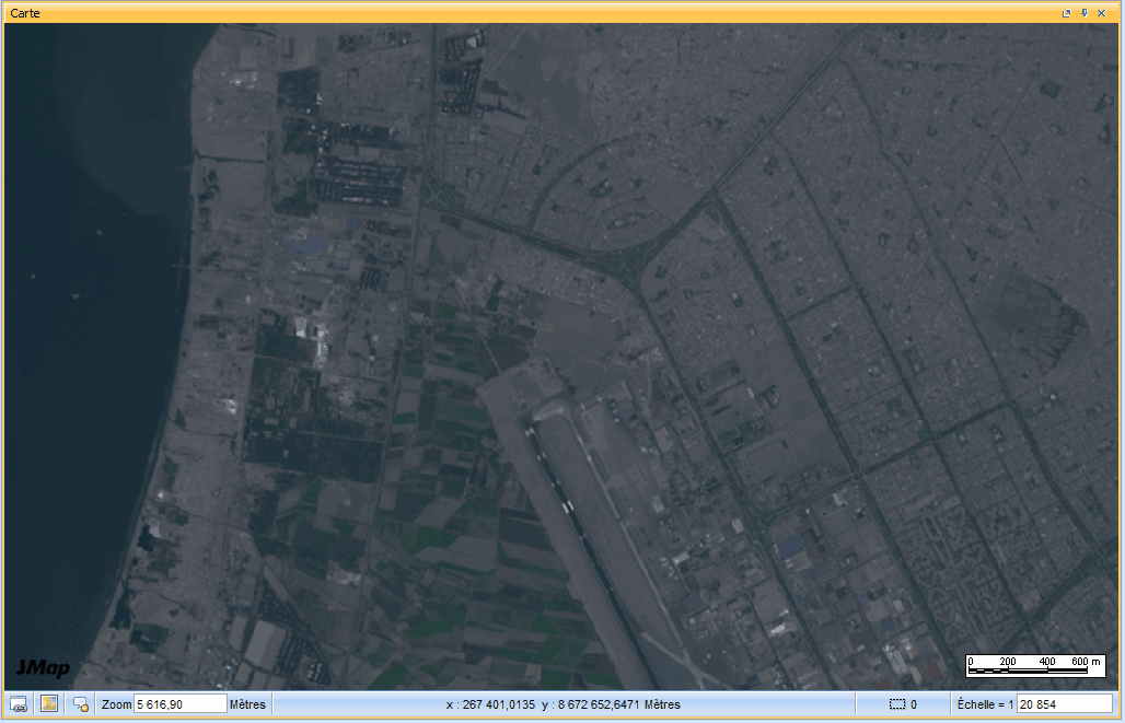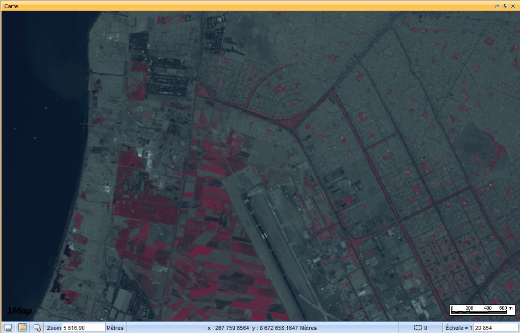 Avec l'option **Colorisé par 3 bandes** il est possible de faire des composés en fausses couleurs permettant de faire ressortir certains éléments clés, comme par exemple la végétation.
