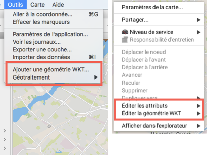 L'interface graphique de l'extension **Edition** est composée de plusieurs parties dont des fonctions accessibles à travers le menu **Outils** et le menu contextuel, une barre d'outils proposant des opérations spatiales et une fenêtre ancrable donnant accès aux outils de dessin.
