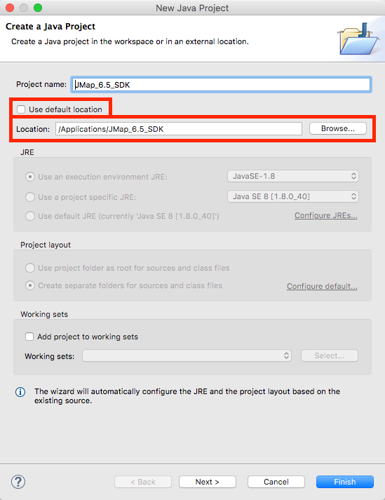 Select the path of the JMap 7 SDK that was specified when it was installed. To do this, you must disable the Use default location option to let Eclipse browse a folder outside of the current workspace. The project name is set automatically when the folder is selected.