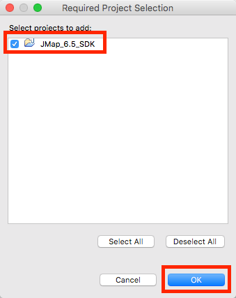 Select the JMap SDK project. All of the SDK’s libraries will become available for your project. Press OK.