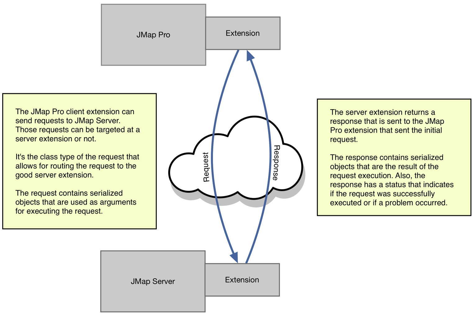 Sends the request passed as a parameter to JMap Server and returns the response generated by JMap Server or by a server extension. This is a blocking method. It is well suited to situations where one must wait for the server’s response before continuing.