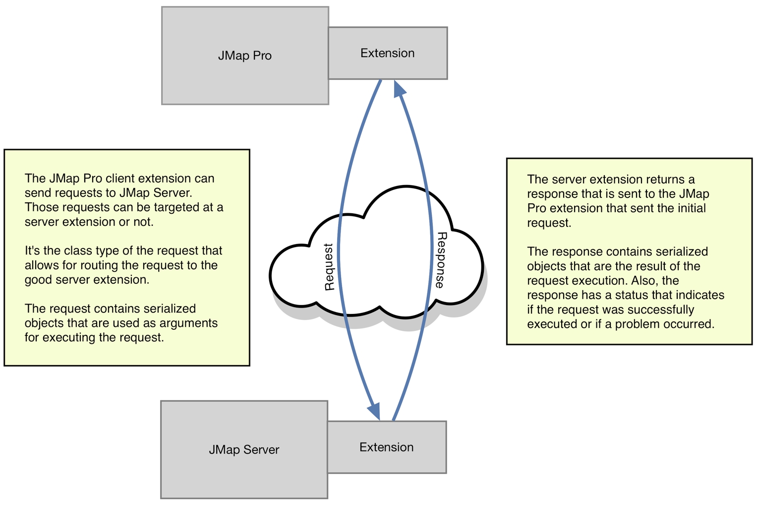 Communication between a JMap Pro (desktop) application and JMap Server is done by exchanging requests and responses. The requests and the responses are in fact serialized objects that must normally be programmed, and these objects will contain the properties required to execute the request and return the information to the client. For example, an application managing citizen requests might have a request and response with the following properties: