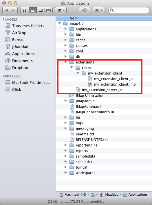 All files that make up the extension (JAR, JNLP, and other files) must be placed in a directory created specifically for the extension and located within the directory for Client Extensions (JMap_HOME/extensions/client). The name of the extension's directory must be identical to the name of the extension's JAR. The following image shows how files and directories are organized in Windows for K2 Geospatial's Edition extension.