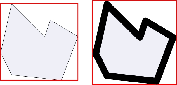 The bounding rectangle of a displayed map element is the smallest rectangle in device coordinates (DC) that completely contains the element, taking its style into account. The style of an element influences the bounding rectangle displayed. For example, a thick polygon border will increase the size of the bounding rectangle, and the size of a point symbol will determine the size of the bounding rectangle on display, and so forth.