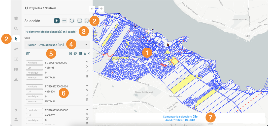 <table data-header-hidden><thead><tr><th width="74.87050359712231"></th><th></th></tr></thead><tbody><tr><td><strong>1</strong></td><td>Los elementos cartográficos seleccionados se indican en amarillo en el mapa. <br>Si usted hace clic en un elemento, éste se mantiene seleccionado mientras que los otros elementos se deseleccionan.</td></tr><tr><td><strong>2</strong></td><td>El panel muestra las herramientas de selección interactiva. <br>La sección <a href="../seleccionar-elementos-en-el-mapa#herramientas-de-seleccion-interactiva">Herramientas de selección interactiva</a> detalla cada una de ellas. <br>Usted puede usarlas para seleccionar elementos del mapa. <br>Cuando usted selecciona elementos en el mapa mediante estas herramientas, los elementos seleccionados en la consulta se deseleccionan.</td></tr><tr><td><strong>3</strong></td><td>Esta leyenda indica la cantidad de elementos seleccionados y la cantidad de capas implicadas.</td></tr><tr><td><strong>4</strong></td><td>El nombre de cada capa con la cantidad de elementos seleccionados en cada una son también indicados.</td></tr><tr><td><strong>5</strong></td><td>Las siguientes herramientas están disponibles para trabajar con los elementos seleccionados:<br>1. Presione <img src="https://2090543877-files.gitbook.io/~/files/v0/b/gitbook-x-prod.appspot.com/o/spaces%2FKFeRW5Kjzju8B2lufaAE%2Fuploads%2Fgit-blob-73da58f64bb1a9e80ff6752a66b1ee6a9429f818%2Fedit-all.png?alt=media" alt="" data-size="line"> para modificar en lote los elementos seleccionados. La sección <a href="editar-datos">Editar datos</a> contiene los detalles de este tema.<br>2. Presione <img src="https://2090543877-files.gitbook.io/~/files/v0/b/gitbook-x-prod.appspot.com/o/spaces%2FKFeRW5Kjzju8B2lufaAE%2Fuploads%2Fgit-blob-a99f960e3ae0ff7ab5218524a445b7eb689c47e2%2Frapport-selection.png?alt=media" alt="" data-size="line"> para abrir un reporte de información de la selección en una nueva pestaña de su navegador. La sección <a href="acceder-a-informacion-sobre-los-elementos-del-mapa/reportes-de-informacion">Reportes de información</a> proporciona detalles sobre este tema.<br>3. Presione <img src="https://2090543877-files.gitbook.io/~/files/v0/b/gitbook-x-prod.appspot.com/o/spaces%2FKFeRW5Kjzju8B2lufaAE%2Fuploads%2Fgit-blob-ce5a3472617a74a4c453baac607da2619ad53d15%2Fcentrer.png?alt=media" alt="" data-size="line"> para centrar el mapa en el conjunto de elementos seleccionados. La escala del mapa cambia y es posible que la capa no se visualice porque la escala del mapa queda fuera del rango de visualización de la capa.<br>4. Presione <img src="https://2090543877-files.gitbook.io/~/files/v0/b/gitbook-x-prod.appspot.com/o/spaces%2FKFeRW5Kjzju8B2lufaAE%2Fuploads%2Fgit-blob-a1fb2c3382425ee17587ef09b75f0f27f810bb11%2Ftable.png?alt=media" alt="" data-size="line"> para abrir una tabla que presenta los datos de los atributos de los elementos seleccionados. El icono cambia de color. La sección <a href="#tabla-de-los-atributos">Tabla de los atributos</a> presenta los detalles de la tabla.<br>5. Presione <img src="https://2090543877-files.gitbook.io/~/files/v0/b/gitbook-x-prod.appspot.com/o/spaces%2FKFeRW5Kjzju8B2lufaAE%2Fuploads%2Fgit-blob-a1fb2c3382425ee17587ef09b75f0f27f810bb11%2Ftable.png?alt=media" alt="" data-size="line"> nuevamente para cerrar la tabla.<br>6. Presione <img src="https://2090543877-files.gitbook.io/~/files/v0/b/gitbook-x-prod.appspot.com/o/spaces%2FKFeRW5Kjzju8B2lufaAE%2Fuploads%2Fgit-blob-6286dbad50ae93f05b8b0ef5a09b47616e0dbd86%2Fdownload%20(1).png?alt=media" alt="" data-size="line"> para descargar un archivo Excel que contiene los valores de los atributos de los elementos seleccionados.<br>7. Presione <img src="https://2090543877-files.gitbook.io/~/files/v0/b/gitbook-x-prod.appspot.com/o/spaces%2FKFeRW5Kjzju8B2lufaAE%2Fuploads%2Fgit-blob-28f35f7b796a82f9cdddbaeecf24b2b71cb76f17%2Fdeselect-all.png?alt=media" alt="" data-size="line"> para deseleccionar todos los elementos.</td></tr><tr><td><strong>6</strong></td><td>Una ficha de cada elemento seleccionado presenta los valores de los atributos:<br>1. Deslice la lista de fichas con el cursor para recorrerla.<br>2. Presione la ficha de un elemento para centrar el mapa en ese elemento. Presione <img src="https://2090543877-files.gitbook.io/~/files/v0/b/gitbook-x-prod.appspot.com/o/spaces%2FKFeRW5Kjzju8B2lufaAE%2Fuploads%2FXlHRi9yqOJmOwj8HcBKJ%2Fng-last-zoom.png?alt=media&#x26;token=6fe288a6-c672-4748-ba08-e0d39e84b8df" alt="" data-size="line"> si desea volver a la vista precedente.<br>3. Presione <img src="https://2090543877-files.gitbook.io/~/files/v0/b/gitbook-x-prod.appspot.com/o/spaces%2FKFeRW5Kjzju8B2lufaAE%2Fuploads%2Fgit-blob-3ef6e36961f3221b541c85b50d009b2753c9ad34%2Farrow-little-down.png?alt=media" alt="" data-size="line"> para abrir la ficha y visualizar todos los atributos.<br>4. Presione <img src="https://2090543877-files.gitbook.io/~/files/v0/b/gitbook-x-prod.appspot.com/o/spaces%2FKFeRW5Kjzju8B2lufaAE%2Fuploads%2Fgit-blob-82b6d8306caa85e32805adee614d7df057f8680d%2Farrow-little-up.png?alt=media" alt="" data-size="line"> para cerrar la ficha.<br>5. Presione <img src="https://2090543877-files.gitbook.io/~/files/v0/b/gitbook-x-prod.appspot.com/o/spaces%2FKFeRW5Kjzju8B2lufaAE%2Fuploads%2Fgit-blob-e3616e3871e36ef986dcb11bbef2d125a9626b35%2Fedit.png?alt=media" alt="" data-size="line"> para modificar el elemento. La sección <a href="editar-datos">Editar datos</a> contiene los detalles de este tema.<br>6. Presione <img src="https://2090543877-files.gitbook.io/~/files/v0/b/gitbook-x-prod.appspot.com/o/spaces%2FKFeRW5Kjzju8B2lufaAE%2Fuploads%2Fgit-blob-da34d65c337ab76003c7fdfbca69d471cac0031c%2Frapport.png?alt=media" alt="" data-size="line"> para abrir el reporte de información del elemento. La sección <a href="acceder-a-informacion-sobre-los-elementos-del-mapa/reportes-de-informacion">Reportes de información</a> proporciona detalles sobre este tema.<br>7. Presione <img src="https://2090543877-files.gi