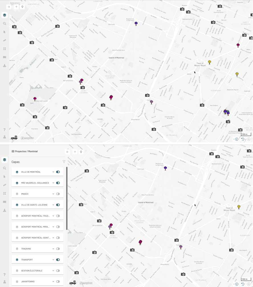 <table data-header-hidden><thead><tr><th width="131.2962962962963" align="center"></th><th></th></tr></thead><tbody><tr><td align="center"><p>​</p><p><img src="https://1947699634-files.gitbook.io/~/files/v0/b/gitbook-x-prod.appspot.com/o/spaces%2FfuLz2JT7jXRIRnUQEea1%2Fuploads%2FDoznnNN5Mn302m7B3xAp%2Farrow_r.png?alt=media&#x26;token=3dd388b1-95d7-4d5a-9956-fa8d7e451499" alt="img" data-size="original"></p><p>​</p></td><td><p>Flecha para abrir el panel. Cada panel presenta el nombre del proyecto abierto.</p><p><img src="https://1947699634-files.gitbook.io/~/files/v0/b/gitbook-x-prod.appspot.com/o/spaces%2FfuLz2JT7jXRIRnUQEea1%2Fuploads%2FsQzy14pCxb6WEWngKmAB%2Fclip006.png?alt=media&#x26;token=1571f863-4e8a-4be9-bf62-5327256fac8a" alt="" data-size="original"></p><p>Para cambiar de proyecto, presione <strong>Proyectos</strong>. La interfaz de los proyectos se abre y usted puede seleccionar un nuevo proyecto presionando sobre su nombre.</p></td></tr><tr><td align="center"><p>​</p><p><img src="https://1947699634-files.gitbook.io/~/files/v0/b/gitbook-x-prod.appspot.com/o/spaces%2FfuLz2JT7jXRIRnUQEea1%2Fuploads%2FNTW96F9t233vJAGGFQ8a%2Farrow_l.png?alt=media" alt="img" data-size="original"></p><p>​</p></td><td>Flecha para cerrar el panel.</td></tr><tr><td align="center"><p>​</p><p><img src="https://1947699634-files.gitbook.io/~/files/v0/b/gitbook-x-prod.appspot.com/o/spaces%2FfuLz2JT7jXRIRnUQEea1%2Fuploads%2F4M1wZxN6QcCbFZVC1jTF%2Fadd-element.png?alt=media&#x26;token=a9c2287d-0d3b-4c9a-a91a-c70d387ddeba" alt="img" data-size="original"></p><p>​</p></td><td>Presione este icono para añadir un elemento cartográfico a una capa editable. <br>La sección <a href="../deseo.../editar-datos">Editar datos</a> detalla las funciones de edición disponibles.</td></tr><tr><td align="center"><p>​</p><p><img src="https://1947699634-files.gitbook.io/~/files/v0/b/gitbook-x-prod.appspot.com/o/spaces%2FfuLz2JT7jXRIRnUQEea1%2Fuploads%2F9fmmrA00Qp0aTVyAVEwZ%2Fsearch%20place.png?alt=media" alt="img" data-size="original"></p><p>​</p></td><td>Buscar un lugar. <br>La sección <a href="navegar-en-el-mapa">Navegar en el mapa</a> detalla esta función.<br>Esta función solo está disponible cuando hay una clave API de Mapbox configurada en JMap Admin. Comuníquese con su administrador de JMap para obtener más detalles.</td></tr><tr><td align="center"><p>​</p><p><img src="https://1947699634-files.gitbook.io/~/files/v0/b/gitbook-x-prod.appspot.com/o/spaces%2FfuLz2JT7jXRIRnUQEea1%2Fuploads%2FAvtGbCpM1nf8yKh6kHLW%2Flayer.png?alt=media&#x26;token=a4860d13-b4b3-4cda-aec8-fbb041d78392" alt="img" data-size="original"></p><p>​</p></td><td>Presione este icono para abrir el panel <strong>Capas</strong>. <br>La sección <a href="../los-datos">Los datos</a> detalla las funciones disponibles.</td></tr><tr><td align="center"><p>​</p><p><img src="https://1947699634-files.gitbook.io/~/files/v0/b/gitbook-x-prod.appspot.com/o/spaces%2FfuLz2JT7jXRIRnUQEea1%2Fuploads%2FUVhNwKPvYO4zQuGt2bUf%2Fsearch.png?alt=media&#x26;token=d948547b-caa9-498b-a8ef-4a6293d39f54" alt="img" data-size="original"></p><p>​</p></td><td>Presione este icono para abrir el panel <strong>Consulta</strong>. <br>La sección <a href="../deseo.../consultar-los-datos">Consultar los datos</a> detalla las funciones disponibles.</td></tr><tr><td align="center"><p>​</p><p><img src="https://1947699634-files.gitbook.io/~/files/v0/b/gitbook-x-prod.appspot.com/o/spaces%2FfuLz2JT7jXRIRnUQEea1%2Fuploads%2Fyb9i8eqv22Jv3Poq6Bu0%2Fselect.png?alt=media&#x26;token=b0fd425d-9ebb-40c3-8e04-9b50d4893787" alt="img" data-size="original"></p><p>​</p></td><td>Presione este icono para abrir el panel <strong>Selección</strong>. <br>La sección <a href="../deseo.../seleccionar-elementos-en-el-mapa">Seleccionar elementos en el mapa</a> detalla las funciones disponibles.</td></tr><tr><td align="center"><p>​</p><p><img src="https://1947699634-files.gitbook.io/~/files/v0/b/gitbook-x-prod.appspot.com/o/spaces%2FfuLz2JT7jXRIRnUQEea1%2Fuploads%2FLwD0qiPLqGW6bhDIML0p%2Fmesure.png?alt=media&#x26;token=35a62ecc-fda7-40f3-a3eb-e040e6a637b1" alt="img" data-size="original"></p><p>​</p></td><td>Presione este icono para abrir el panel <strong>Mediciones</strong>. <br>La sección <a href="../deseo.../medir-distancias-y-superficies">Medir distancias y superficies</a> detalla las funciones disponibles.</td></tr><tr><td align="center"><p>​</p><p><img src="https://1947699634-files.gitbook.io/~/files/v0/b/gitbook-x-prod.appspot.com/o/spaces%2FfuLz2JT7jXRIRnUQEea1%2Fuploads%2FaJk8Caddnu12uUIv3sjo%2Fannotation.png?alt=media&#x26;token=28d3d37c-acfc-41f4-b721-d57753a34dfa" alt="img" data-size="original"></p><p>​</p></td><td>Presione este icono para abrir el panel <strong>Anotaciones</strong>. <br>La sección <a href="../deseo.../efectuar-anotaciones-en-el-mapa">Efectuar anotaciones</a> detalla las funciones disponibles.</td></tr><tr><td align="center"><p>​</p><p><img src="https://1947699634-files.gitbook.io/~/files/v0/b/gitbook-x-prod.appspot.com/o/spaces%2FfuLz2JT7jXRIRnUQEea1%2Fuploads%2Fa7V9ysuSW7MjL98XLlME%2Fcontext.png?alt=media&#x26;token=9e45f79a-0850-4427-8dd5-974fe14352da" alt="img" data-size="original"></p><p>​</p></td><td>Presione este icono para abrir el panel <strong>Mis mapas</strong>. <br>La sección <a href="../deseo.../crear-y-administrar-mapas-personalizados">Crear y administrar mapas personalizados</a> detalla las funciones disponibles.</td></tr><tr><td align="center"><p>​</p><p><img src="https://1947699634-files.gitbook.io/~/files/v0/b/gitbook-x-prod.appspot.com/o/spaces%2FfuLz2JT7jXRIRnUQEea1%2Fuploads%2Ft9ASBZqf6TjtWni8UH1o%2Fprint.png?alt=media&#x26;token=95687d75-760b-4c89-a4bb-18ff88ebf6e1" alt="img" data-size="original"></p><p>​</p></td><td><p>Presione este icono para abrir el panel <strong>Exportar / Impresión</strong>. </p><p>La sección <a href="../deseo.../exportar-imprimir-un-mapa">Exportar / Imprimir un mapa</a> detalla las funciones disponibles. <