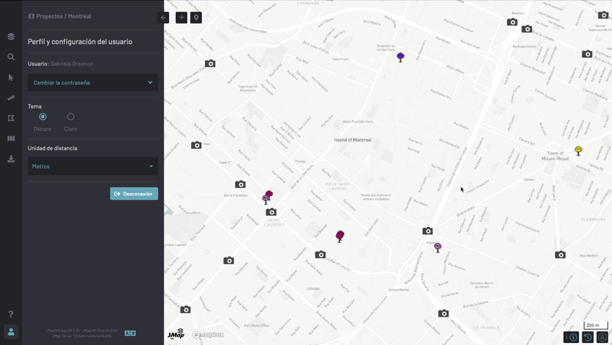 El panel **Perfil y configuración del usuario** ofrece funciones básicas para personalizar la interfaz de JMap NG.