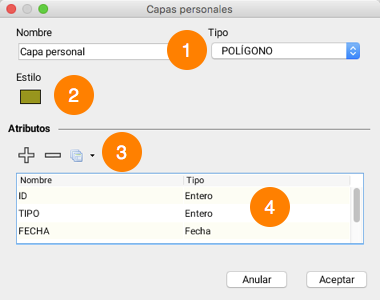 <table data-header-hidden><thead><tr><th width="63.239436619718305"></th><th></th></tr></thead><tbody><tr><td><strong>1</strong></td><td><strong>Nombre</strong>: Ingrese el nombre de la capa. Los nombres no deben ser únicos pero se aconseja utilizar nombres significativos. Los nombres pueden incluir espacios. <strong>Tipo</strong>: Seleccione el tipo de elementos (punto, línea o polígono) que contendrá la capa.</td></tr><tr><td><strong>2</strong></td><td>Presione este botón para configurar el estilo de los elementos de la capa.</td></tr><tr><td><strong>3</strong></td><td>Puede definir la lista de los atributos de la capa. Los valores de los atributos podrán ser ingresados mediante un formulario o mediante el explorador de elementos.<br>Presione <img src="https://2090543877-files.gitbook.io/~/files/v0/b/gitbook-x-prod.appspot.com/o/spaces%2FKFeRW5Kjzju8B2lufaAE%2Fuploads%2Fgit-blob-8178e3603971d879957eca0a5f7640ae06b8c002%2Fplus.png?alt=media" alt="img"> para añadir un atributo a una capa personal.<br>Presione <img src="https://2090543877-files.gitbook.io/~/files/v0/b/gitbook-x-prod.appspot.com/o/spaces%2FKFeRW5Kjzju8B2lufaAE%2Fuploads%2Fgit-blob-9ea3b4eaebe16e34202e70df12ae4b6d9c02d235%2Fminus.png?alt=media" alt="img"> para remover un atributo de la capa personal.<br>Si resulta necesario, presione <img src="https://2090543877-files.gitbook.io/~/files/v0/b/gitbook-x-prod.appspot.com/o/spaces%2FKFeRW5Kjzju8B2lufaAE%2Fuploads%2Fgit-blob-d76448e34a04f5c94794597f91ade6f423b3f6cf%2Ftable_multiple.png?alt=media" alt="img"> y seleccione una capa existente para copiar la lista de sus atributos.</td></tr><tr><td><strong>4</strong></td><td>Esta tabla presenta la lista de los atributos definidos para la capa personal. Cuando añada un nuevo atributo, usted podrá ingresar su nombre y el tipo de datos que contendrá.<br>Nota: No es posible modificar el nombre ni el tipo de un atributo existente.</td></tr></tbody></table>