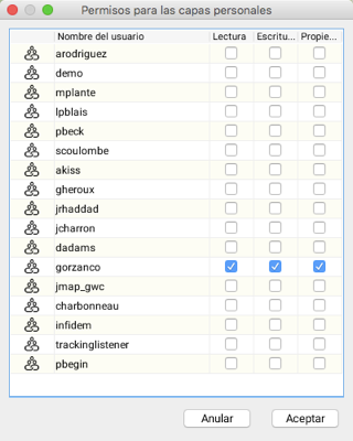 Para compartir una capa personal, presione en la ventana de administración de capas personales. La ventana siguiente se abrirá mostrando la lista de usuarios. Puede seleccionar los permisos a acordar a cada uno de ellos.