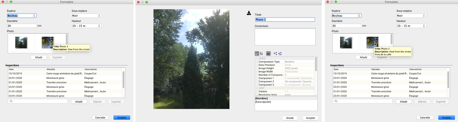 Si el formulario contiene un campo apropiado, usted puede añadir fotos (standard y 360 grados) a partir del sistema de archivos de su computadora. Puede añadir también un título y comentarios a las fotos que han sido tomadas mediante una aplicación de tipo JMap Survey o a fotos cuyos archivos han sido subidos utilizando formularios de aplicaciones de tipo JMap Pro y JMap NG. Para ello: