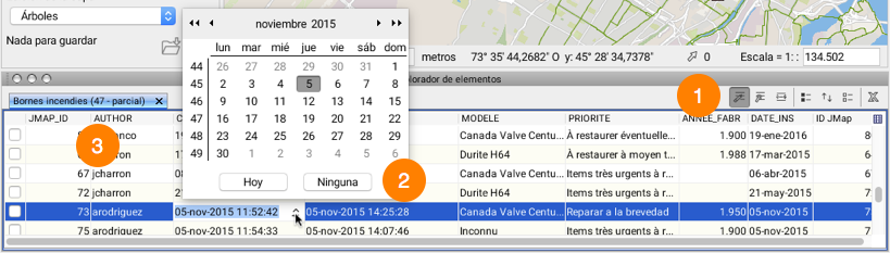 <table data-header-hidden><thead><tr><th width="79"></th><th></th></tr></thead><tbody><tr><td><strong>1</strong></td><td>Presione <img src="https://2090543877-files.gitbook.io/~/files/v0/b/gitbook-x-prod.appspot.com/o/spaces%2FKFeRW5Kjzju8B2lufaAE%2Fuploads%2Fgit-blob-eec9cf33b0d97df83ff8b30c96a61f2e8924dafe%2Fedit_attributes_18x18%20(1).png?alt=media" alt=""> para activar el modo edición. En este modo, todos los valores de los atributos modificables pueden ser ingresados o modificados.<br>Presione un campo para modificar su valor. Los campos de tipo fecha presentan un calendario para facilitar el ingreso de datos. Los valores ingresados son validados para asegurar su compatibilidad con el tipo de atributo.<br>Para obtener más información sobre el funcionamiento del explorador de elementos, consulte la sección <a href="../explorador-de-elementos">Explorador de elementos</a>.</td></tr><tr><td><strong>2</strong></td><td>Haga clic en un campo para ingresar o modificar el valor de un atributo.</td></tr><tr><td><strong>3</strong></td><td>Ciertos atributos no pueden ser editados (Author, Creation Time, Modification Time, ID JMap). Son atributos del sistema y sus valores son completados automáticamente por JMap.</td></tr></tbody></table>