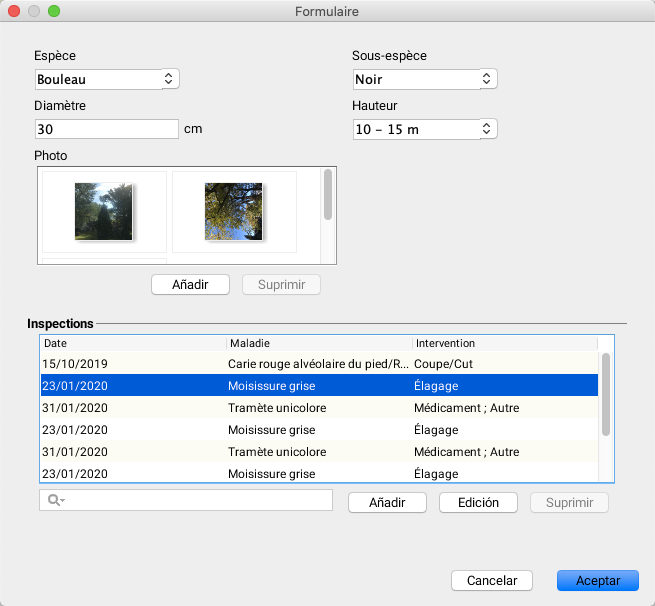 Los formularios pueden contener subformularios imbricados para ingresar, por ejemplo, la información sobre inspecciones de un elemento a lo largo del tiempo tal como ilustra la figura siguiente.