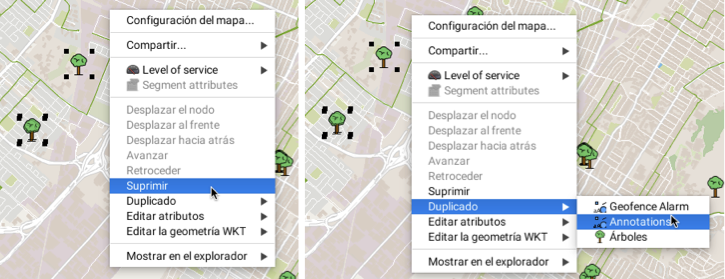 Los elementos se añaden a la capa **Annotations**. Pueden ser guardados en un contexto o seleccionados y duplicados en otras capas editables usando el menú contextual. Este menú permite también suprimir los elementos y modificar su posición vertical.