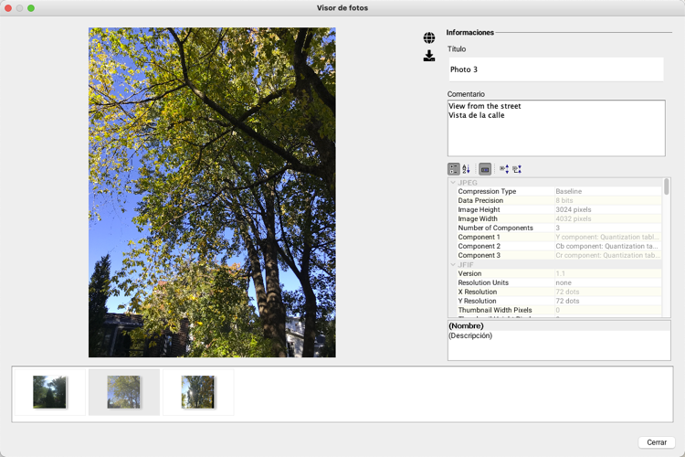 6. Metadatos de la foto pueden estar disponibles y usted puede modificar su modo de presentación.