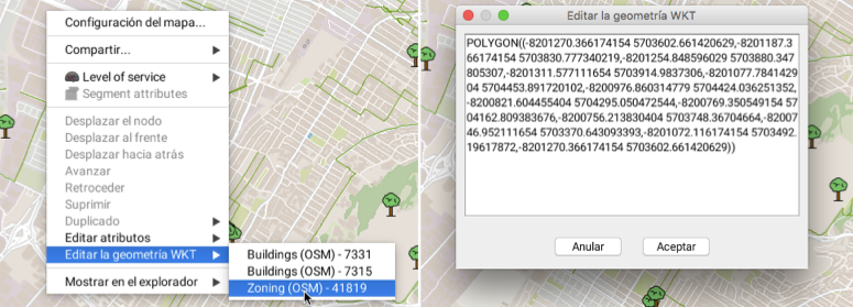 El menú contextual permite también editar los elementos del mapa en el formato WKT. La función **Editar la geometría WKT** muestra los elementos de las distintas capas que se encuentran en el punto del mapa en el que se abrió el menú contextual. Seleccione uno de esos elementos, para abrir la ventana que contiene las coordenadas y datos del elemento. Si usted cuenta con los permisos necesarios puede editar esos datos.