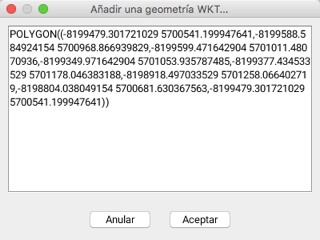 La extensión **Edition** permite también editar elementos en formato WKT. Usted puede añadir elementos a partir de **Herramientas** **-> Añadir una geometría WKT** en la barra de menús. Una ventana se despliega para escribir las coordenadas de los elementos que desea añadir.