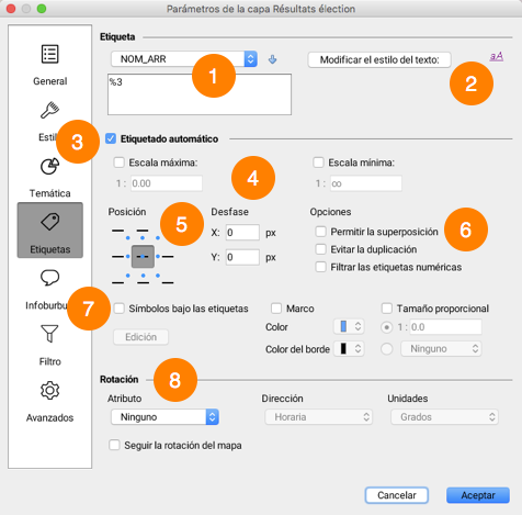 <table data-header-hidden><thead><tr><th width="70.97047970479704"></th><th></th></tr></thead><tbody><tr><td><strong>1</strong></td><td>Ingrese el texto de la etiqueta.<br>Utilice la función <code>ev(attrib)</code> para insertar el valor del atributo especificado entre paréntesis.<br>La lista de atributos permite seleccionar los atributos y añadirlos al texto presionando el botón con la flecha hacia abajo.<br>Las etiquetas soportan también la programación en JavaScript para efectuar operaciones matemáticas y operaciones sobre las cadenas de caracteres utilizando los valores de los atributos.<br>El texto puede extenderse en varias líneas.</td></tr><tr><td><strong>2</strong></td><td>Presione este botón para modificar el estilo con el que se visualizará el texto de las etiquetas (fuente, tamaño, color, etc.).</td></tr><tr><td><strong>3</strong></td><td>Active el etiquetado automático para que las etiquetas de los elementos de la capa se muestren de manera automática según los parámetros especificados.</td></tr><tr><td><strong>4</strong></td><td>Las escalas mínima y máxima permiten limitar la visualización automática de las etiquetas al rango de escalas así definido.</td></tr><tr><td><strong>5</strong></td><td>Seleccione la posición relativa de la etiqueta respecto del elemento al que se vincula. Ciertas posiciones están disponibles sólo para algunos tipos de elementos.</td></tr><tr><td><strong>6</strong></td><td><strong>Permitir la superposición</strong>: Permite que las etiquetas de esta capa se superpongan entre ellas y con las etiquetas de las otras capas.<br><strong>Evitar la duplicación</strong>: Filtrar las etiquetas que se visualizarán para que no se repita el mismo texto. Si varias etiquetas tienen el mismo texto, solamente la primera será mostrada. Es útil para el nombre de las calles, por ejemplo.<br><strong>Filtrar las etiquetas numéricas</strong>: Si la etiqueta contiene texto y números, se visualizarán solamente los números. Esta opción es útil cuando se desea, por ejemplo, mostrar el número de las carreteras utilizando un atributo que contiene otro texto también (“Autopista 40” se transforma en “40”).</td></tr><tr><td><strong>7</strong></td><td><strong>Símbolo bajo la etiqueta</strong>: Seleccione esta opción para elegir un símbolo que se visualizará bajo el texto de la etiqueta. Tenga en cuenta que el texto de la etiqueta debería poder entrar dentro del símbolo seleccionado. Esta opción se utiliza principalmente para los símbolos de las carreteras que contienen el número de las mismas.<br><strong>Marco</strong>: Seleccione esta opción para rodear el texto de la etiqueta con un marco.<br><strong>Color</strong>: Puede seleccionar un color para la trama del fondo del marco.<br><strong>Borde del marco</strong>: Puede seleccionar un color distinto para el borde del marco.<br><strong>Tamaño proporcional</strong>: Por defecto, el texto de las etiquetas se muestra siempre con el tamaño de fuente especificado, independientemente de la escala del mapa. Utilice esta opción para que el tamaño del texto se ajuste proporcionalmente a la escala del mapa. El texto se visualizará con el tamaño especificado cuando el mapa se visualice en la escala de referencia ingresada. Cuando la escala cambie, el tamaño del texto se modificará también.</td></tr><tr><td><strong>8</strong></td><td>Estas opciones permiten controlar la rotación de las etiquetas.<br><strong>Atributo</strong>: Seleccione el atributo que contiene el ángulo de la rotación a aplicar a cada símbolo de la capa. Sólo están disponibles los atributos numéricos.<br><strong>Dirección</strong>: Si un atributo es utilizado para la rotación, indique si el sentido de la rotación es horario o antihorario.<br><strong>Seguir la rotación del mapa</strong>: Seleccione esta opción para que las etiquetas sigan la rotación del mapa. Si se aplica una rotación al mapa, se aplicará la misma rotación a las etiquetas.</td></tr></tbody></table>
