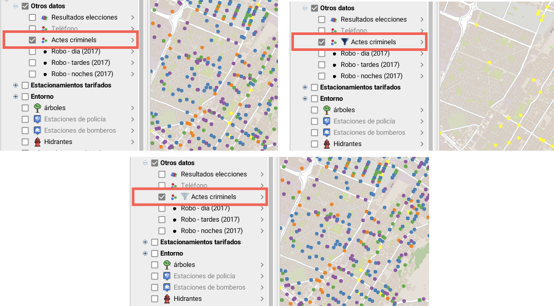El icono ![](https://2090543877-files.gitbook.io/~/files/v0/b/gitbook-x-prod.appspot.com/o/spaces%2FKFeRW5Kjzju8B2lufaAE%2Fuploads%2Fgit-blob-9c40dc707b0c85b3c283c9d65a88f88d3e23131d%2Ffiltre%20\(1\).png?alt=media) adyacente al nombre de la capa indica que un filtro está activo. El filtro se puede desactivar desmarcando la casilla correspondiente. En ese caso se visualizan todos los elementos de la capa y el icono ![](https://2090543877-files.gitbook.io/~/files/v0/b/gitbook-x-prod.appspot.com/o/spaces%2FKFeRW5Kjzju8B2lufaAE%2Fuploads%2Fgit-blob-175cb3ebd15989b5e7eefc23d929bfc4ab094ddb%2Ffiltre_inactif.png?alt=media) indica que existe un filtro configurado para la capa.