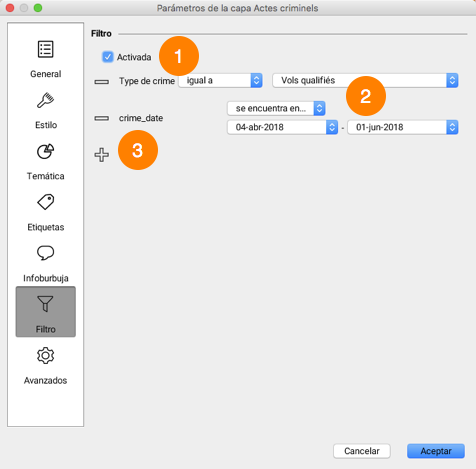 <table data-header-hidden><thead><tr><th width="84.08771929824562"></th><th></th></tr></thead><tbody><tr><td><strong>1</strong></td><td>Marque la casilla para activar el filtro. Los elementos que no pasan el filtro no se visualizan en la capa. Usted puede desactivar el filtro sin eliminarlo.</td></tr><tr><td><strong>2</strong></td><td>Atributos que componen el filtro.<br>Cada atributo está asociado a un <a href="#operadores-de-filtros">operador</a> y un valor del atributo. Los operadores varían en función del atributo.</td></tr><tr><td><strong>3</strong></td><td>Haga clic sobre el icono para añadir un atributo al filtro.</td></tr></tbody></table>