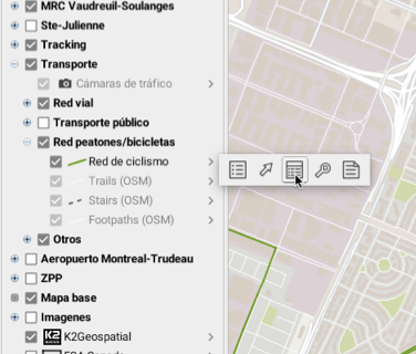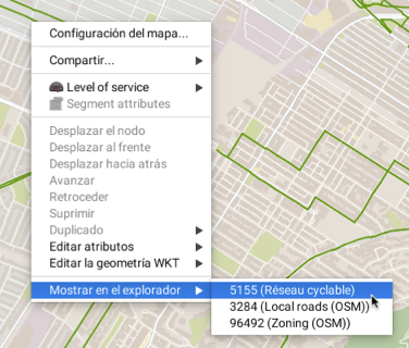 El explorador de elementos puede ser activado a partir del administrador de capas. También puede ser abierto haciendo clic en el botón derecho del cursor posicionado sobre un elemento del mapa y seleccionando el menú **Mostrar en el explorador**. El explorador de elementos se abre y selecciona la línea de atributos correspondiente al elemento. De manera inversa, un doble clic en una línea de la tabla genera un zoom sobre el elemento correspondiente en el mapa, el cual parpadea brevemente.