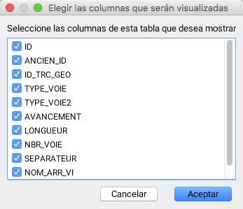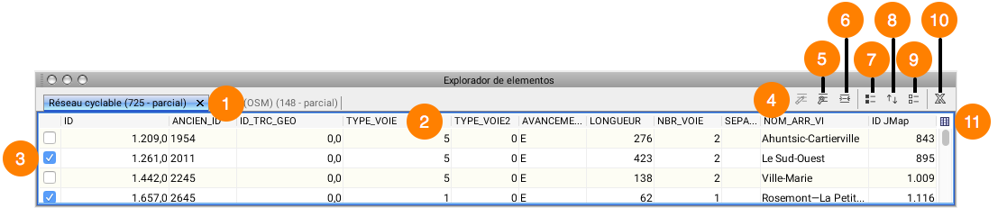 El explorador de elementos muestra los atributos vinculados a los elementos de las capas. Cada tabla corresponde a una capa en particular y cada línea de la tabla representa un elemento de la capa. Esta interfaz ofrece varias posibilidades para trabajar con los atributos.