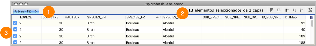 El explorador de la selección muestra los atributos vinculados a los elementos seleccionados en las distintas capas. Cada capa está representada por una pestaña.