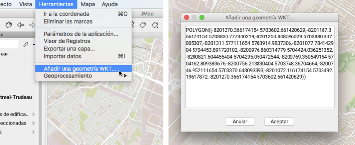 Se accede a la función a partir del menú **Herramientas -> Añadir una geometría WKT** en la barra de menús. Se despliega una ventana para escribir las coordenadas de los elementos que se añaden.