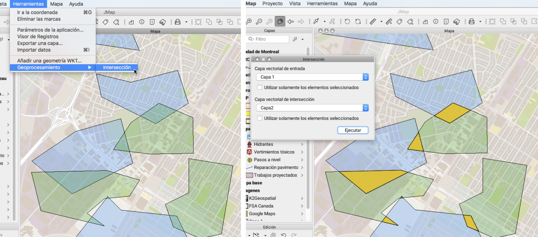 Seleccione en los menús desplegables las capas cuyos elementos serán intersectados y presione Ejecutar.
