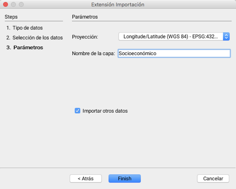 <table data-header-hidden><thead><tr><th width="225.38461538461542"></th><th></th></tr></thead><tbody><tr><td>Proyección</td><td>El menú desplegable permite seleccionar la proyección de los datos.<br>Se puede elegir la opción <strong>Ninguna</strong>.<br>El administrador de JMap determina los sistemas de proyección que estarán disponibles para el usuario.</td></tr><tr><td>Nombre de la capa</td><td>Los datos serán importados en una capa cuyo nombre se especifica aquí.</td></tr><tr><td>Importar otros datos</td><td>Se puede indicar que se importarán otros datos para retornar automáticamente a la primera etapa.</td></tr></tbody></table>