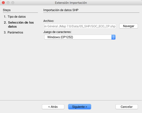 <table data-header-hidden><thead><tr><th width="199.61728395061732"></th><th></th></tr></thead><tbody><tr><td>Archivo</td><td>Selección del archivo SHP que se va a importar.</td></tr><tr><td>Windows (CP1252)</td><td>Menú desplegable para seleccionar el juego de caracteres utilizado en los atributos almacenados en el archivo DBF.<br>Si este parámetro no se define correctamente, probablemente algunos caracteres no se visualizarán de manera correcta.<br>El valor por defecto es CP1252, y resulta adecuado en la mayor parte de los casos.</td></tr></tbody></table>
