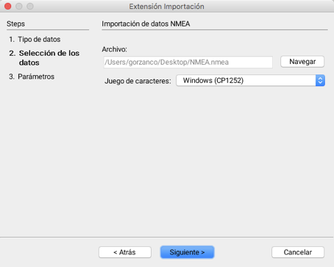 La segunda etapa de la importación de datos provenientes de GPS que responden a las normas NMEA, implica la selección del conjunto de datos que se desea importar.