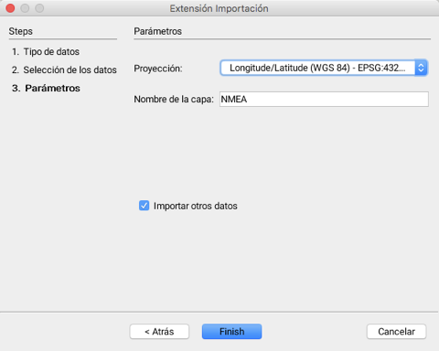 <table data-header-hidden><thead><tr><th width="242.38461538461542"></th><th></th></tr></thead><tbody><tr><td>Proyección</td><td>Todas las tramas NMEA tienen el elipsoide WG84 como base del sistema de coordenadas.<br>La proyección que se propone al usuario incluye entonces ese elipsoide.</td></tr><tr><td>Nombre de la capa</td><td>Los datos serán importados en una capa cuyo nombre se especifica aquí.</td></tr><tr><td>Importar otros datos</td><td>Se puede indicar que se importarán otros datos para retornar automáticamente a la primera etapa.</td></tr></tbody></table>
