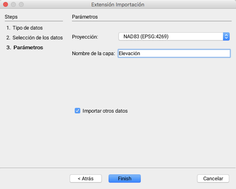 <table data-header-hidden><thead><tr><th width="237.9002320185615"></th><th></th></tr></thead><tbody><tr><td>Proyección</td><td>El menú desplegable permite seleccionar la proyección de los datos.<br>Los sistemas de proyección que estarán disponibles para el usuario son determinados por el servidor WMS.<br>La proyección de los datos debe ser la misma que la del proyecto ya que JMap no reproyecta los datos matriciales.</td></tr><tr><td>Nombre de la capa</td><td>Los datos serán importados en una capa cuyo nombre se especifica aquí.<br>Por defecto, el nombre será derivado de los nombres de los conjuntos de datos que se importan.</td></tr><tr><td>Importar otros datos</td><td>Se puede indicar que se importarán otros datos para retornar automáticamente a la primera etapa.</td></tr></tbody></table>